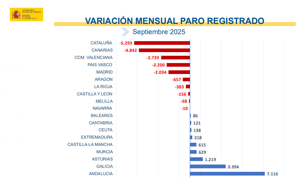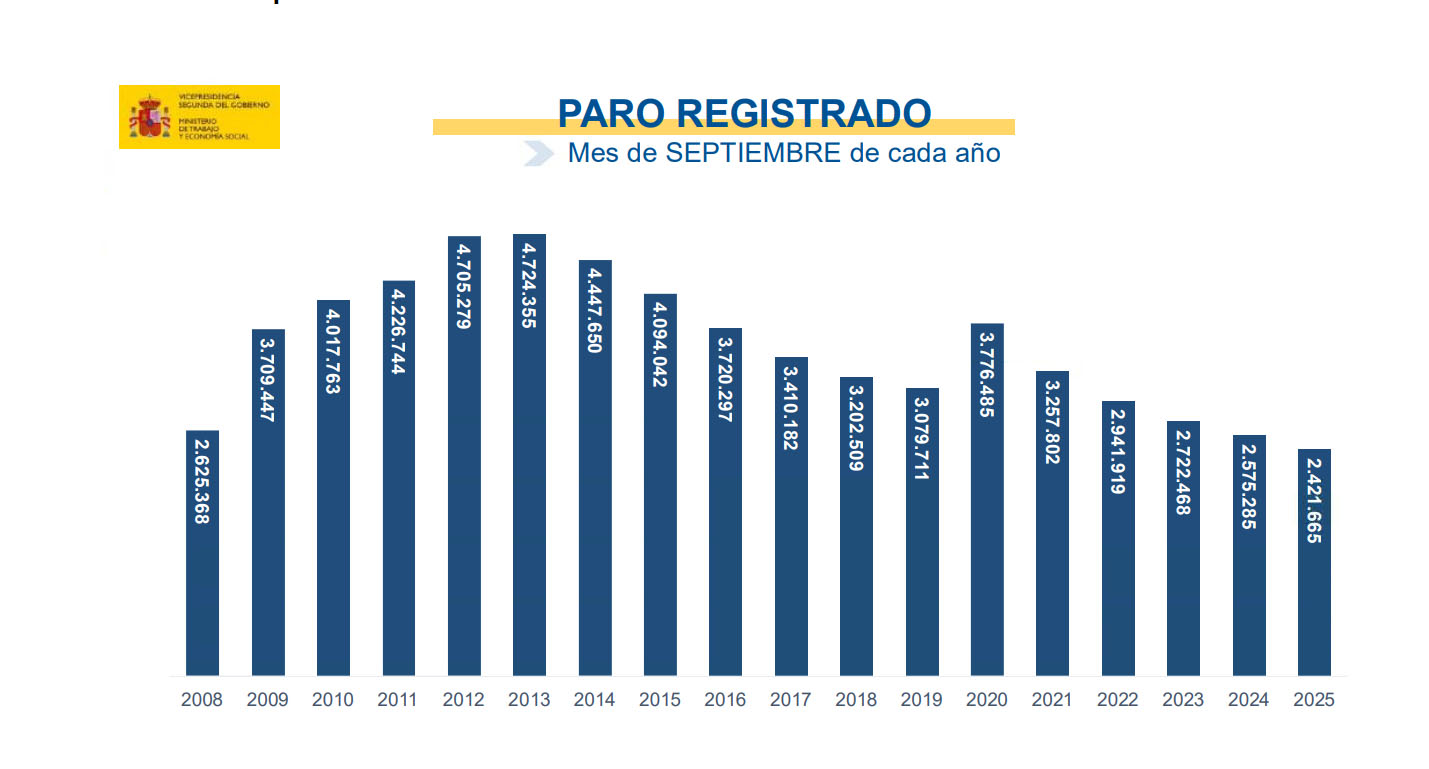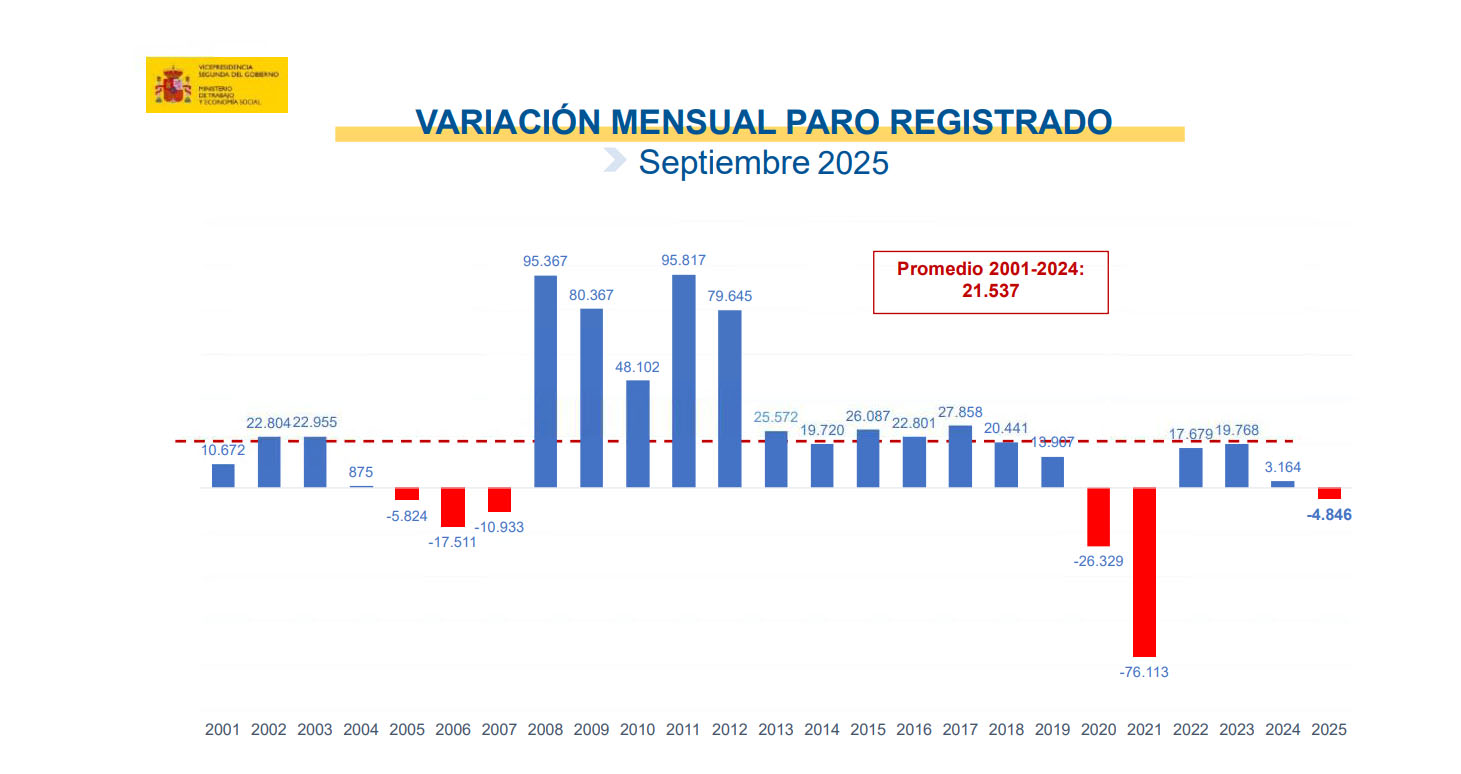 El total de personas desempleadas registradas en las oficinas del Servicio Público de Empleo Estatal (SEPE) ha disminuido en 4.846 en septiembre de 2025 respecto al mes anterior. Es la primera vez que el paro desciende en este mes desde el año 2007 si exceptuamos el periodo de la pandemia.