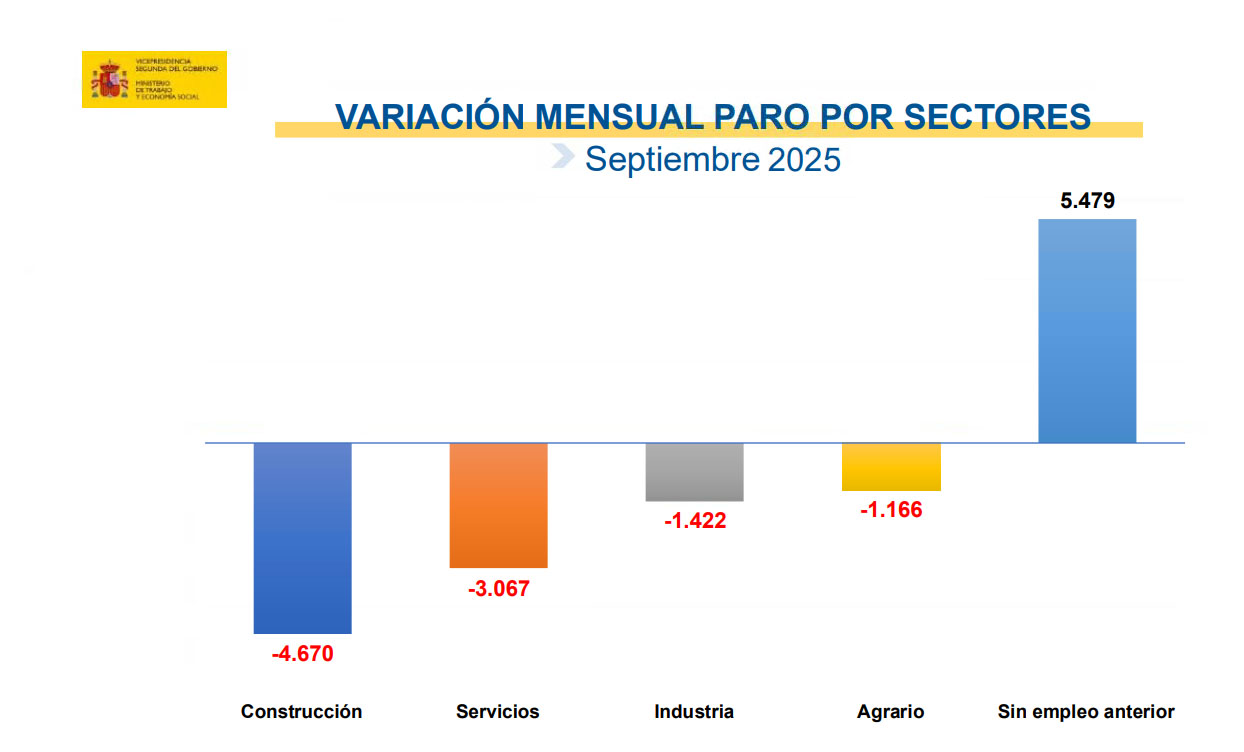 Por sectores económicos con respecto a agosto, el paro registrado desciende en Construcción en 4.670 personas (-2,59%), Servicios 3.067 (-0,17%), Industria 1.422 (-0,75%) y en Agricultura 1.166 (-1,52%).