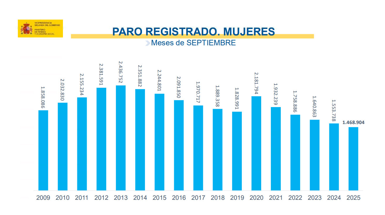 Si lo comparamos con septiembre de 2024, el paro masculino baja en 68.786 (-6,73%) y el femenino cae en 84.834 (-5,46%).