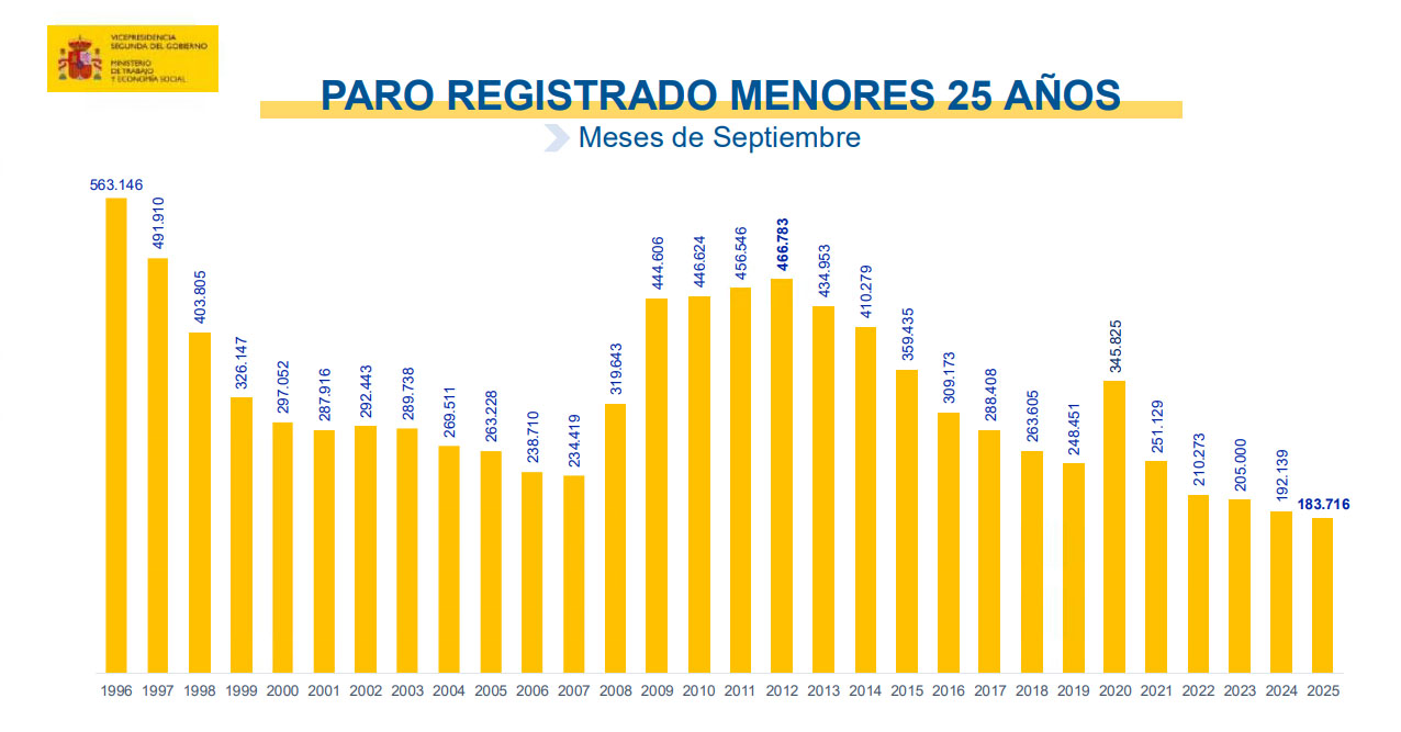 El desempleo de los jóvenes menores de 25 años asciende en el mes de septiembre en 16.085 personas (9,60%) respecto al mes anterior. El total es de 183.716 personas jóvenes, la cifra más baja de la serie histórica un mes de septiembre.
