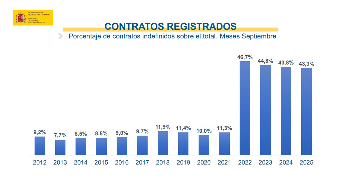 El número total de contratos registrados durante el citado mes ha sido de 1.533.773. De ellos, 663.825 contratos de trabajo son de carácter indefinido y representan el 43,28% de todos los contratos.