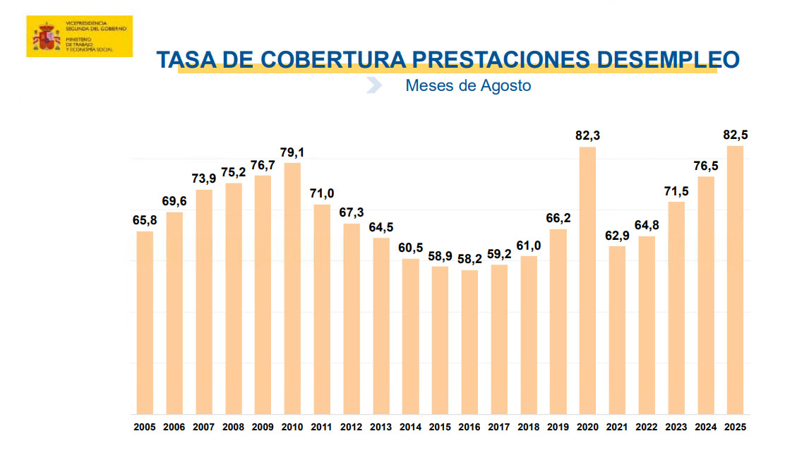 La cobertura del sistema de protección por desempleo durante el mes de agosto de 2025 ha sido del 82,51%, la mayor de toda la serie histórica.