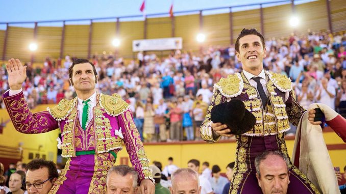 Talavante (dcha.) y Morante (izq.), saliendo a hombros en Almodóvar del Campo el pasado 20 de septiembre – CRËDITOS Arenas de San Nicasio.