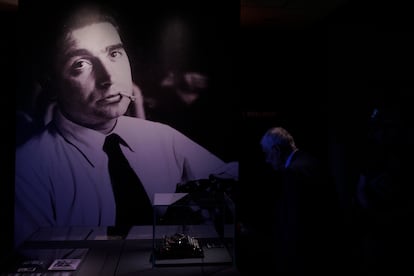 Retrato de Robert Capa en una de las paredes de la exposición del Círculo de Bellas Artes.Sergio Pérez (EFE)