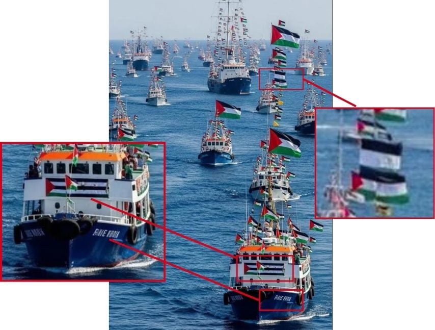 Algunas banderas tienen franjas dobles negras y no incluyen el color verde ni el rojo, y otras directamente están flotando en el mar sin que correspondan a ningún barco. Además, no hay rastro en las redes sociales de la Flotilla o en su web de estas imágenes.