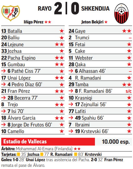 En lo deportivo, el Rayo pasó por encima del Shkendija, que pagó la rabia de la última derrota ante el Sevilla. Los de Iñigo Pérez no dieron la mínima posibilidad a su rival durante la primera hora de partido. Por ocasiones, el resultado pudo ser mucho más abultado.