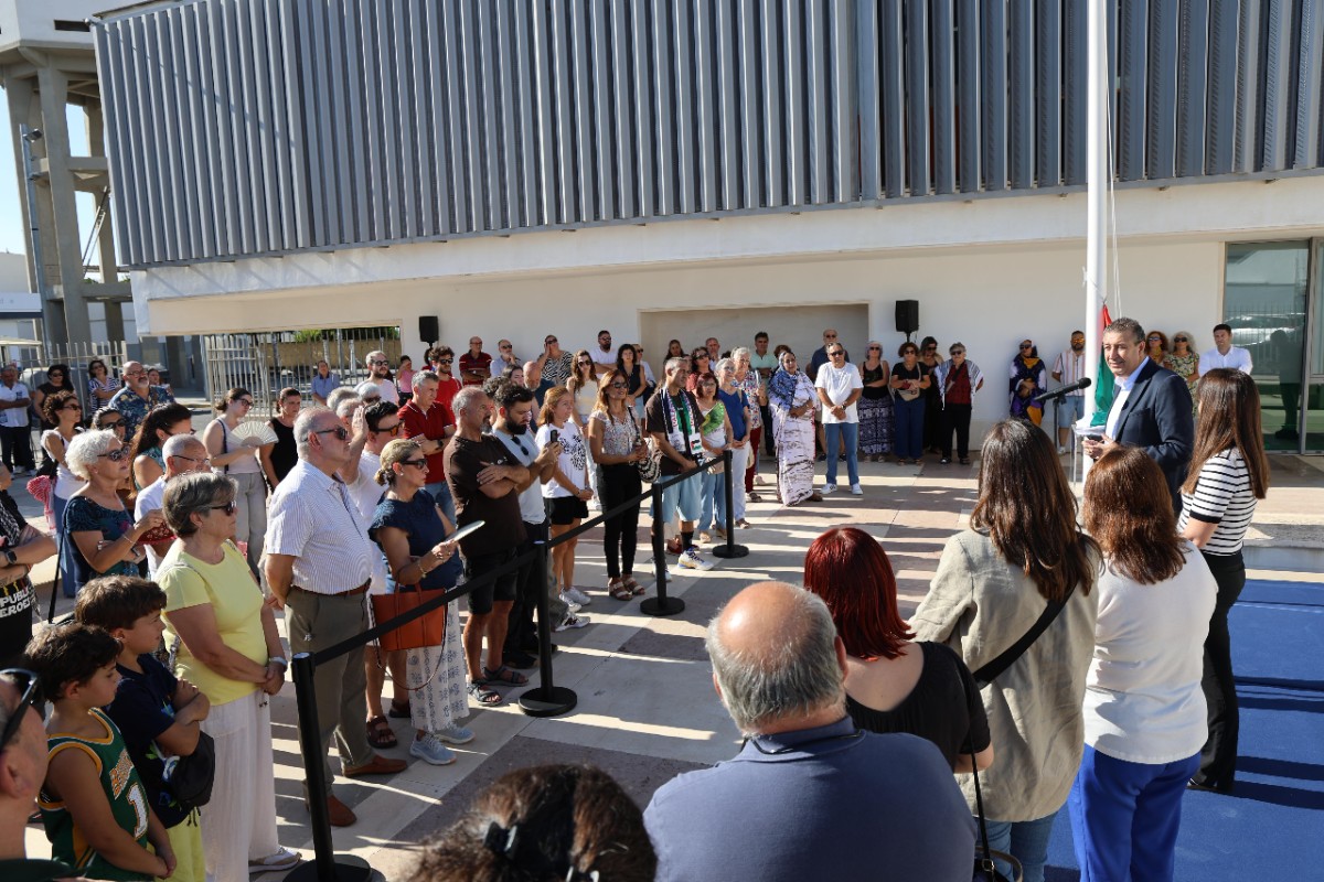 El Ayuntamiento de La Rinconada ha izado en el patio de las dependencias municipales una bandera de Palestina como símbolo del apoyo del municipio al pueblo palestino. El acto, en el que hubo un centenar de personas, con las intervenciones del alcalde, Javier Fernández, y de la delegada de Cooperación Internacional, Reyes Romero.