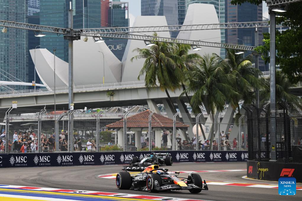 SINGAPUR, 3 octubre, 2025 (Xinhua) — El piloto neerlandés de la escudería Red Bull, Max Verstappen (frente), compite durante la primera sesión de práctica del Gran Premio de Singapur 2025 de Fórmula 1, en Singapur, el 3 de octubre de 2025. (Xinhua/Then Chih Wey)