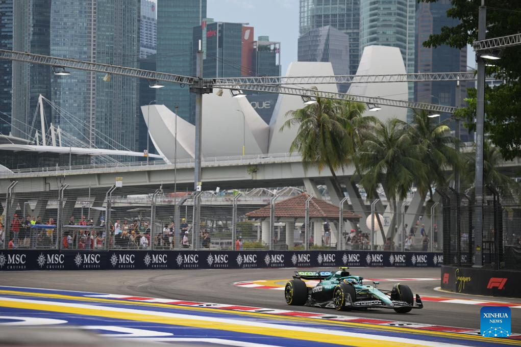 SINGAPUR, 3 octubre, 2025 (Xinhua) — El piloto español de la escudería Aston Martin, Fernando Alonso, compite durante la primera sesión de práctica del Gran Premio de Singapur 2025 de Fórmula 1, en Singapur, el 3 de octubre de 2025. (Xinhua/Then Chih Wey)