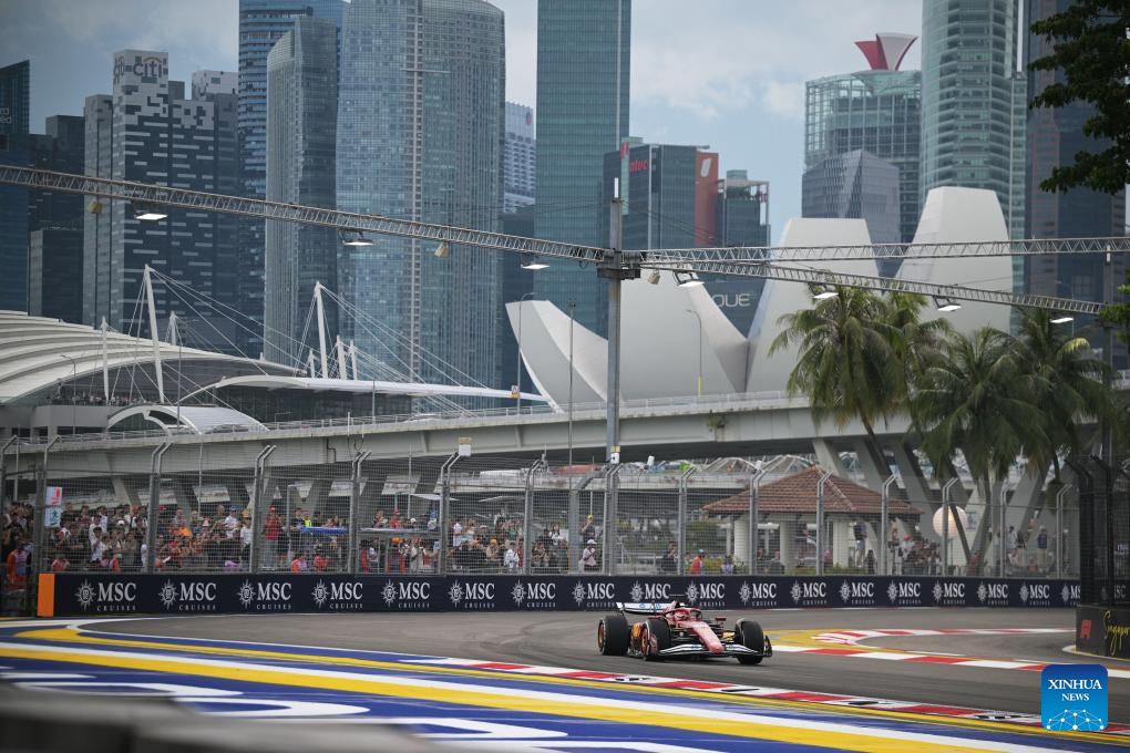 SINGAPUR, 3 octubre, 2025 (Xinhua) — El piloto monegasco de la escudería Ferrari, Charles Leclerc, compite durante la primera sesión de práctica del Gran Premio de Singapur 2025 de Fórmula 1, en Singapur, el 3 de octubre de 2025. (Xinhua/Then Chih Wey)