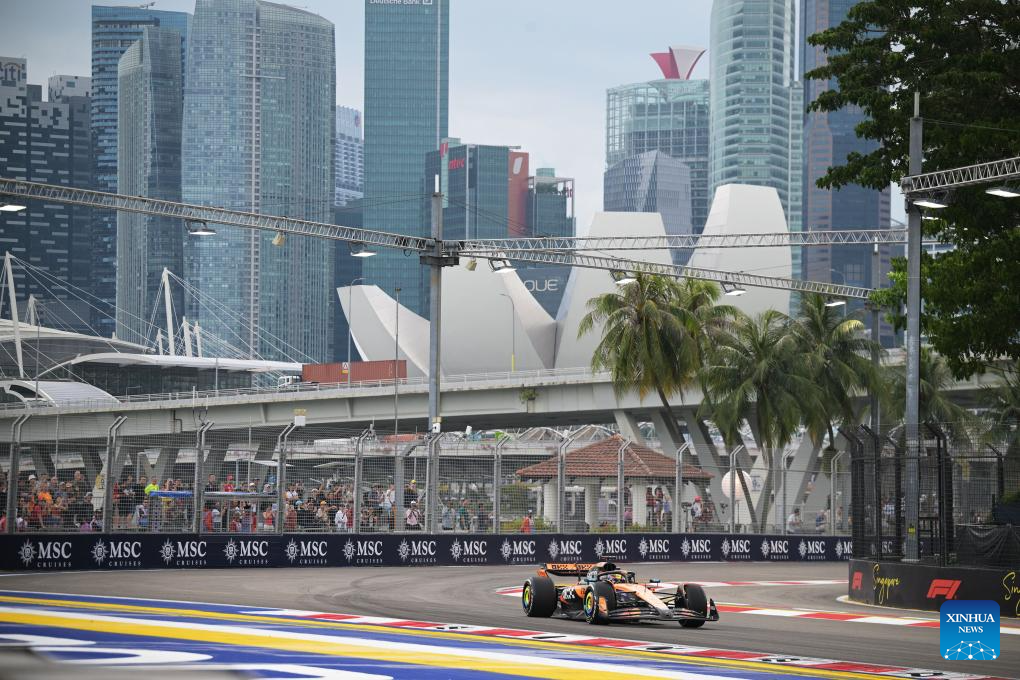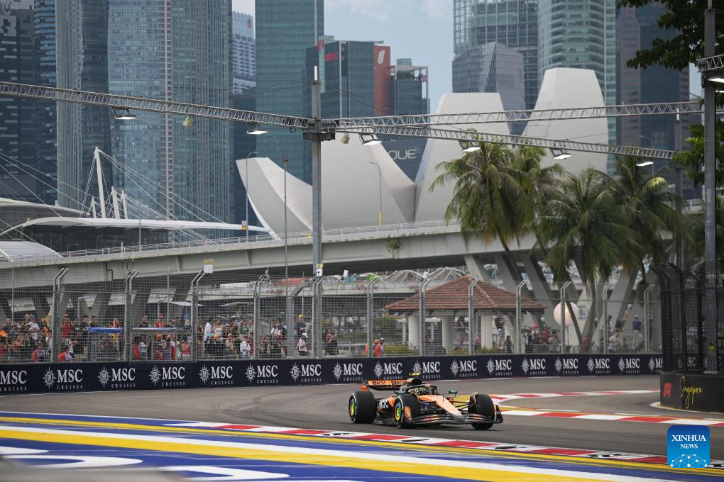 SINGAPUR, 3 octubre, 2025 (Xinhua) — El piloto británico de la escudería McLaren, Lando Norris, compite durante la primera sesión de práctica del Gran Premio de Singapur 2025 de Fórmula 1, en Singapur, el 3 de octubre de 2025. (Xinhua/Then Chih Wey)