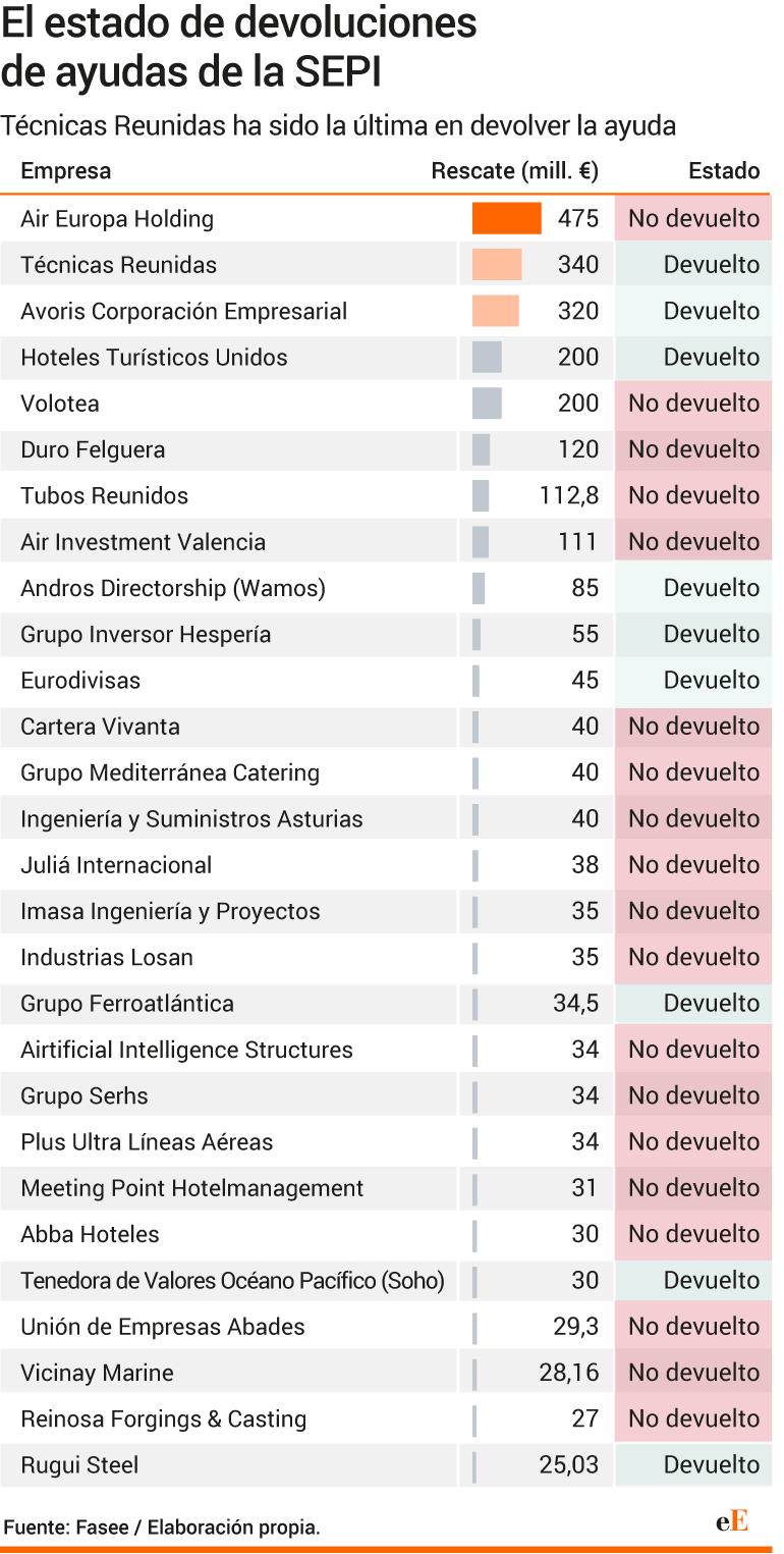 Lo cierto es que Técnicas Reunidas no es el único grupo industrial que ha liquidado ya la ayuda de la SEPI. Ferroatlántica canceló este verano la ayuda pendiente con el Estado que ascendía en su caso a 17,25 millones de euros [ver gráfico]. Esta cifra correspondía al segundo pago del préstamo establecido por calendario, sumando los intereses correspondientes.