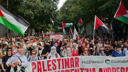 Llegados desde distintos puntos del País Vasco y Navarra, miles de manifestantes —50.000 según los organizadores y 10.000 según la Delegación del Gobierno— recorrieron Pamplona para denunciar “genocidio” y expresar solidaridad con el pueblo palestino. “Gaza, aguanta, el mundo se levanta”, “Boikot Israel” o “Gora palestinar erresistentzia (viva la resistencia palestina)” fueron algunas de las consignas de una marcha multitudinaria.
