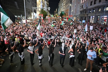 En Madrid, una multitud se unió a la manifestación, que salió desde la estación de Atocha a las 18.00 horas. “Hagamos ruido y que se enteren de que de verdad nos parece una injusticia lo que está pasando en Gaza”, afirma Celia Balandín, uno de los muchos rostros jóvenes en la protesta, que según las entidades convocantes logró la respuesta de 500.000 personas, cifra que la Delegación del Gobierno rebajó a algo menos de 100.000. “Que dejen de masacrar, permitan entrar el alimento y se reconozca al Estado palestino”, reivindica Aixa Bulaizh, de 71 años. A su lado, Paloma Fernández, de 67, se muestra contenta al ver a tanta gente joven. Cuenta que participa en los actos en solidaridad con Gaza desde hace dos años y que esta marcha, “sin duda, es la más multitudinaria”.