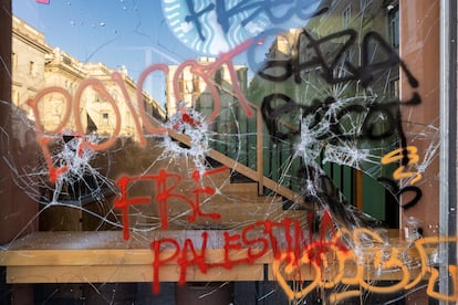 Una luna rota y llena de pintadas este sábado en Barcelona.Marta Pérez (EFE)