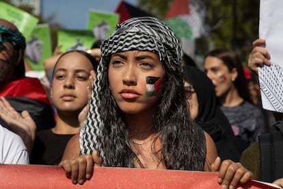 Una asistente a la manifestación de este sábado en la capital catalana, con la bandera palestina pintada en la cara.Gianluca Battista