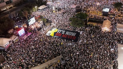 La sensación imperante es que esta vez sí es la definitiva. Y que “todos” (uno de los cánticos que todos corean en la protesta junto con la palabra “ahora”) volverán a casa en los próximos días, aunque la mayoría sea ya en ataúdes, solo para que sus seres queridos puedan velarlos. “Es ahora o nunca. Y tiene que ser ahora, señor primer ministro”, lanza a Netanyahu desde el estrado Lior Ashkenazi, un popular actor implicado en la causa desde el principio. En las pancartas se puede leer “Socorro, ya van dos años” o “Amamos a Trump”.