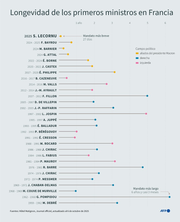 Los dos primeros -el conservador Michel Barnier y el centrista François Bayrou- cayeron ante el Parlamento cuando intentaban aprobar los presupuestos. Lecornu presentó su dimisión antes incluso de intentarlo.