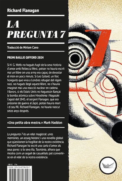 La historia de amor de Rebecca West y H. G. Wells está narrada con chispa y con la gracia de una buena novela de aventuras, mientras que el relato de la creación de la bomba atómica adquiere un tono reflexivo (en la mejor tradición de la novela de ideas). Ambas —aventuras e ideas— se entremezclan de manera sorprendentemente natural. Sobre West y Wells: en 1912 ella tenía 19 años, él 46. Ella escribió una reseña demoledora contra él y su novela Matrimonio en la revista feminista The Freewoman (“el manierismo del señor Wells resulta desquiciante”); él la invitó a su casa para saber de dónde salía aquella muchacha intrépida. Aquel hombre casado representaba todo lo que ella detestaba, pero Rebecca West aceptó el encuentro. La mujer de Wells la condujo hasta la biblioteca. Bastó media hora de conversación para que West supiera que no había un hombre en toda Inglaterra ni en toda Europa comparable a él. Y Wells, por su parte, descubrió que ella poseía todas las cualidades de las que él carecía. Ante una estantería llena de libros, mientras hablaban de estilo literario, se besaron. Tras el fuego, H. G. Wells hizo lo más sensato: huir —para cometer luego la imprudencia de volver (estuvieron juntos diez años)—. Pero ese beso provocó una reacción en cadena: ese beso es el hilo conductor de La pregunta 7. Sin ese vértigo erótico, el escritor no se habría refugiado en Suiza para escribir ese libro en el que arde el mundo, y sin ese libro Leo Szilard nunca habría concebido una reacción nuclear en cadena, y sin concebir una reacción nuclear en cadena, el piloto Thomas Ferebee no habría accionado la palanca a las 8:15 del 6 de agosto de 1945 a 9.500 metros de altitud sobre Hiroshima, y más de 200.000 personas habrían seguido con vida, y el padre de Flanagan habría muerto.