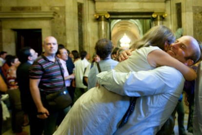 Dos personas se abrazan en el Parlamento de Cataluña el 28 de julio de 2010 tras la votación que prohibió los toros.CARLES RIBAS