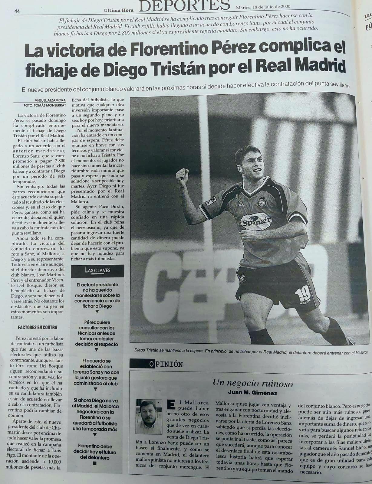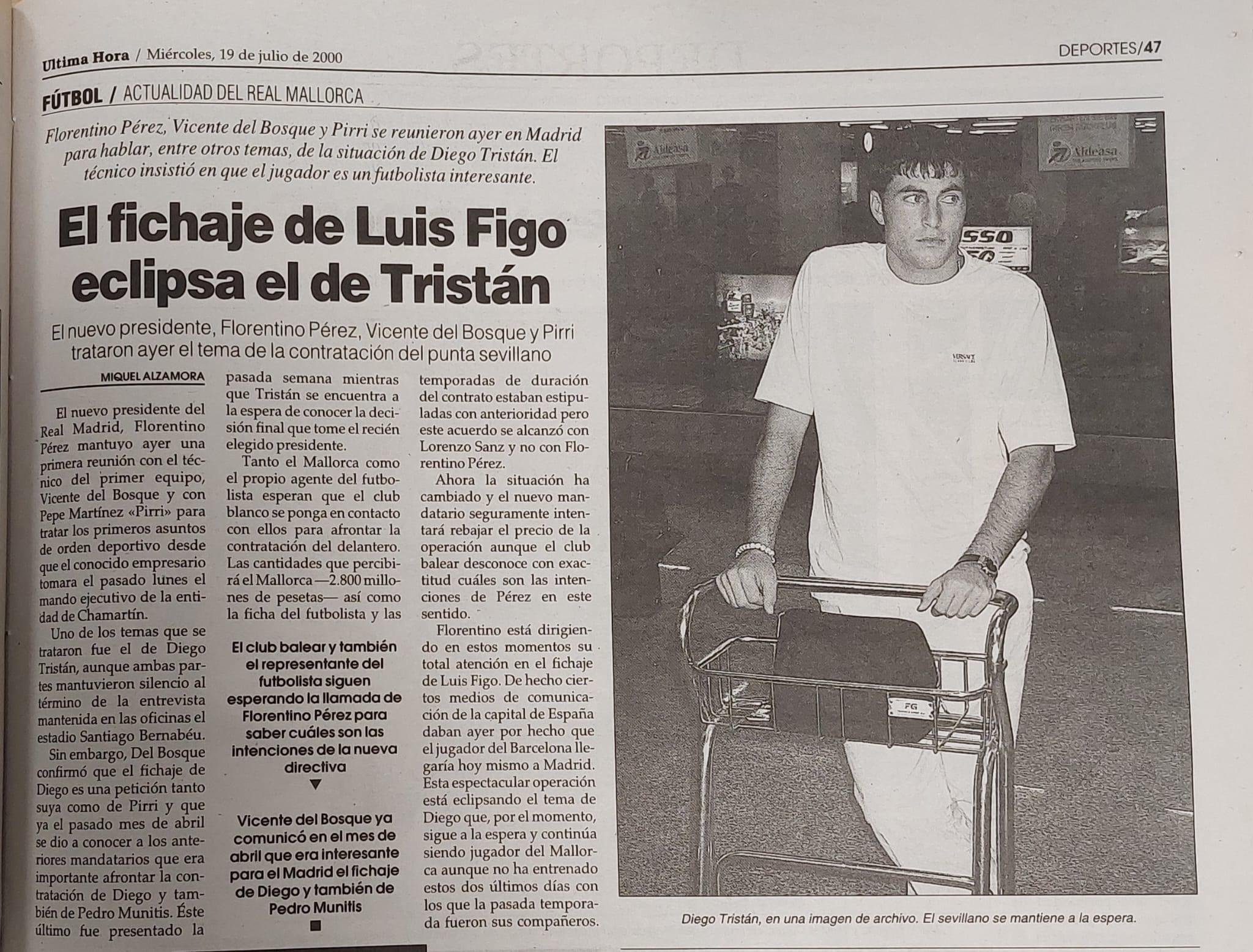 El 16 de julio de 2000 Florentino Pérez ganó las elecciones a la presidencia del Real Madrid. Venció a Lorenzo Sanz gracias a dos hechos puntuales, de una parte la movilización del voto por correo y de otra el anuncio el 5 de julio del fichaje de Luis Figo por el Real Madrid si él era elegido presidente. Esa operación salpicó de lleno al Real Mallorca y concretamente a uno de sus futbolistas: Diego Tristán. Florentino, que en las anteriores elecciones había perdido frente a Ramón Mendoza, sacó todos los tanques para no volver a caer derrotado y apostó a ganador. Afirmó ante la incredulidad azulgrana, que Figo jugaría en el Madrid y que si no podía cumplir con su promesa, abonaría el carnet a todos los socios. Figo llegó al Madrid previo pago de 60 millones de euros.