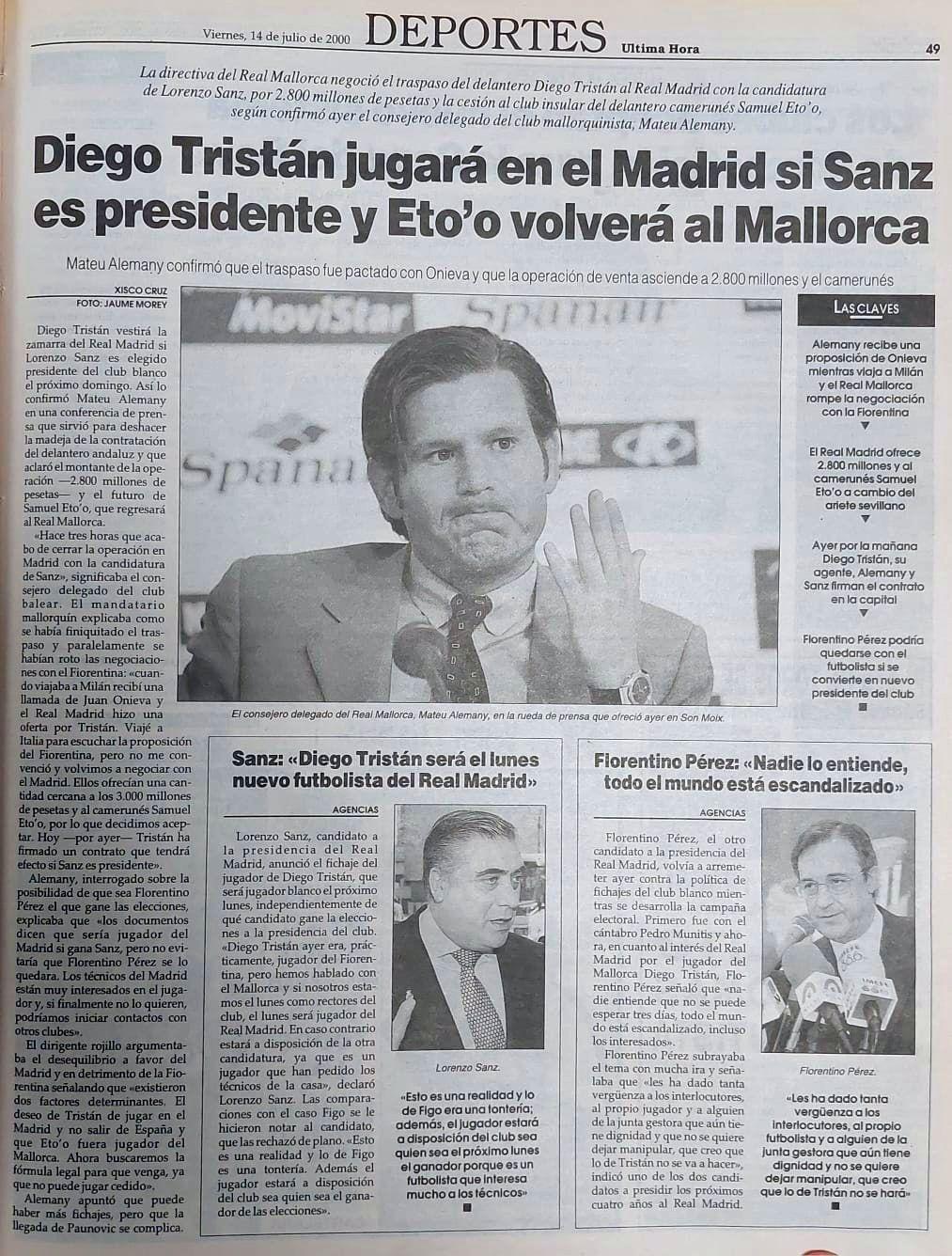 «Hace tres horas que acabo de cerrar la operación en Madrid con la candidatura de Sanz», significaba el consejero delegado del club balear. El mandatario mallorquín explicaba como se había finiquitado el traspaso y paralelamente se habían roto las negociaciones con el Fiorentina: «cuando viajaba a Milán recibí una llamada de Juan Onieva y el Real Madrid hizo una oferta por Tristán. Viajé a Italia para escuchar la proposición del Fiorentina, pero no me convenció y volvimos a negociar con el Madrid. Ellos ofrecían una cantidad cercana a los 3.000 millones de pesetas y al camerunés Samuel Eto’o, por lo que decidimos aceptar. Ayer Tristán ha firmado un contrato que tendrá efecto si Sanz es presidente».
