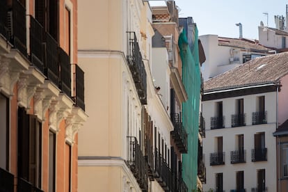 Una lona de obras en el edificio que se ha derrumbado, en la zona de Ópera, este martes en Madrid.Alejandro Martínez Vélez – Eur (Europa Press)