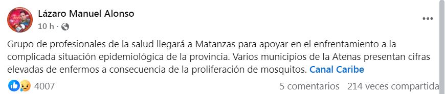 El periodista oficialista Lázaro Manuel Alonso informó en Facebook que un “grupo de profesionales de la salud llegará a Matanzas para apoyar en el enfrentamiento a la complicada situación epidemiológica”, y comparó el operativo con los refuerzos médicos enviados durante el colapso hospitalario de la pandemia de COVID-19.