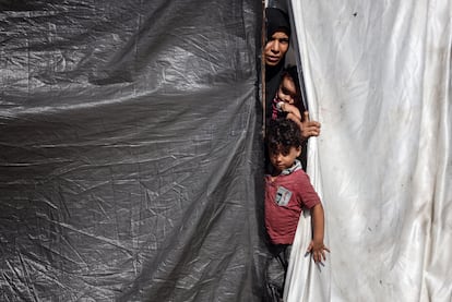 Desplazados palestinos en una tienda de campaña hecha con trozos de tela en el campamento de refugiados de Al Bureij, en el centro de Gaza, este martes.NurPhoto (NurPhoto via Getty Images)