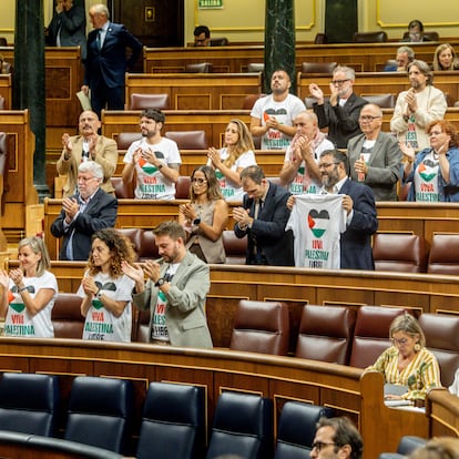 Varios diputados de Sumar muestran camisetas a favor de Palestina, durante una sesión plenaria, en el Congreso de los Diputados, a 7 de octubre de 2025, en Madrid (España). El Pleno del Congreso debate y vota hoy la Iniciativa Legislativa Popular (ILP) promovida para acabar con el blindaje legal de la tauromaquia y dejar de considerarla patrimonio cultural, un texto que recabó más de 700.000 firmas de ciudadanos y que cuenta con el respaldo de buena parte de los socios parlamentarios del PSOE. Los promotores de esta iniciativa ciudadana ‘No es mi cultura’, que representan a unas 200 asociaciones animalistas, entregaron el pasado mes de febrero en el Congreso un total de 715.606 firmas para instar a la derogación de la Ley 18/2013, que delimita la tauromaquia como parte del patrimonio cultural digno de protección en todo el territorio nacional.
