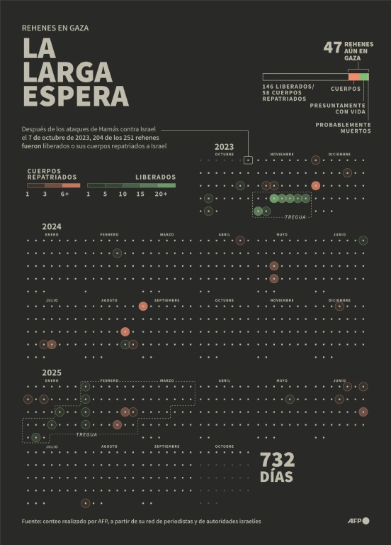 Veinte rehenes israelíes presuntamente vivos cumplieron el martes dos años de cautiverio en la Franja de Gaza, pero su destino sigue siendo incierto en un momento en que se celebran negociaciones indirectas en El Cairo con vistas a su liberación y al fin de la guerra entre Israel y Hamás.