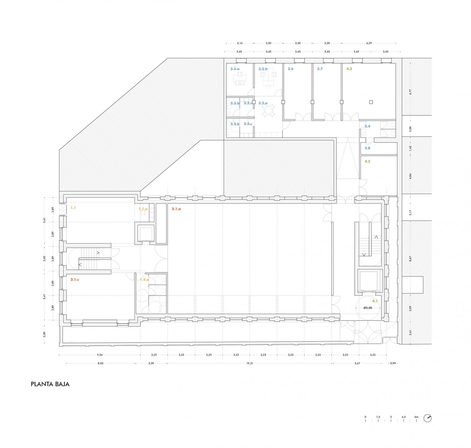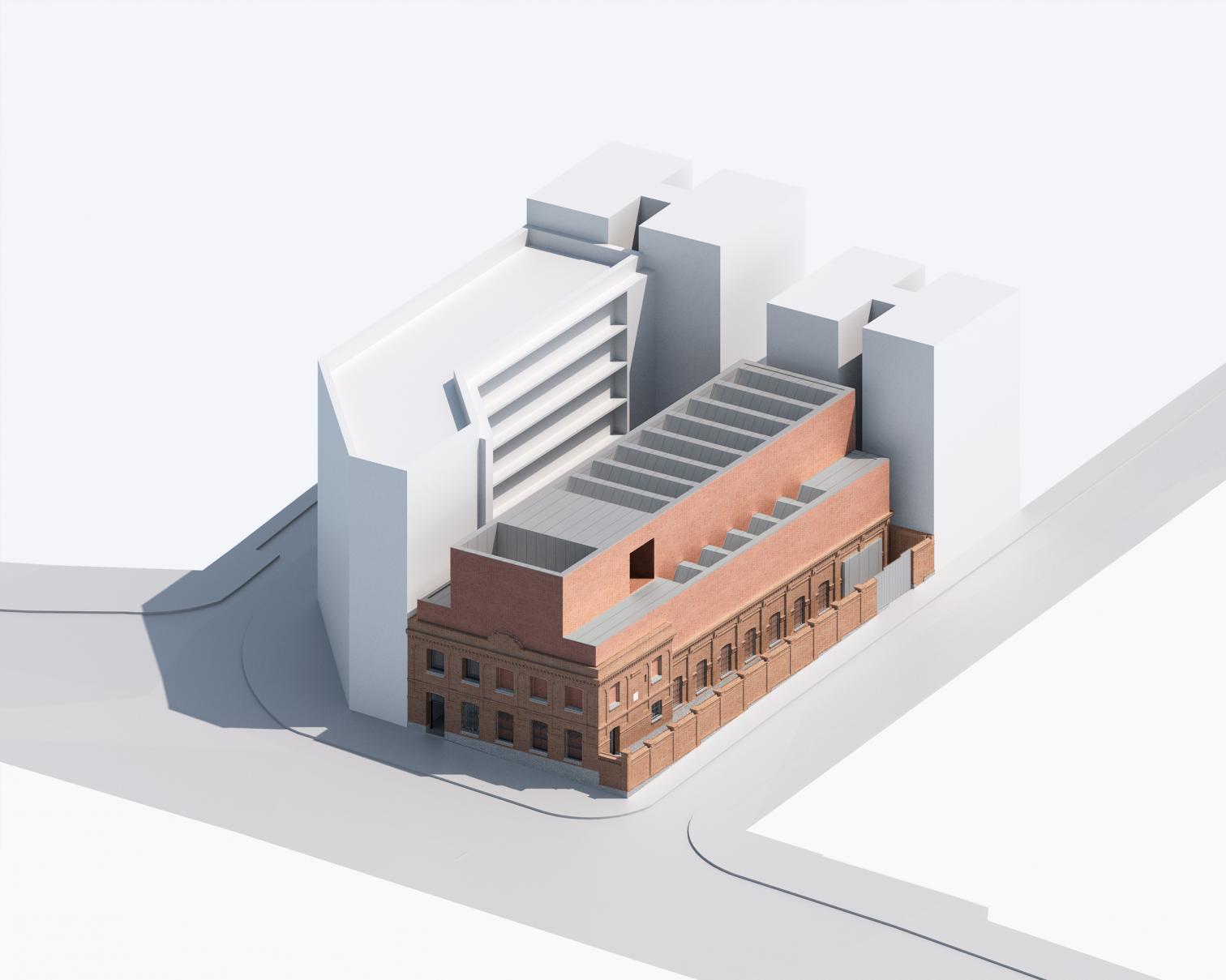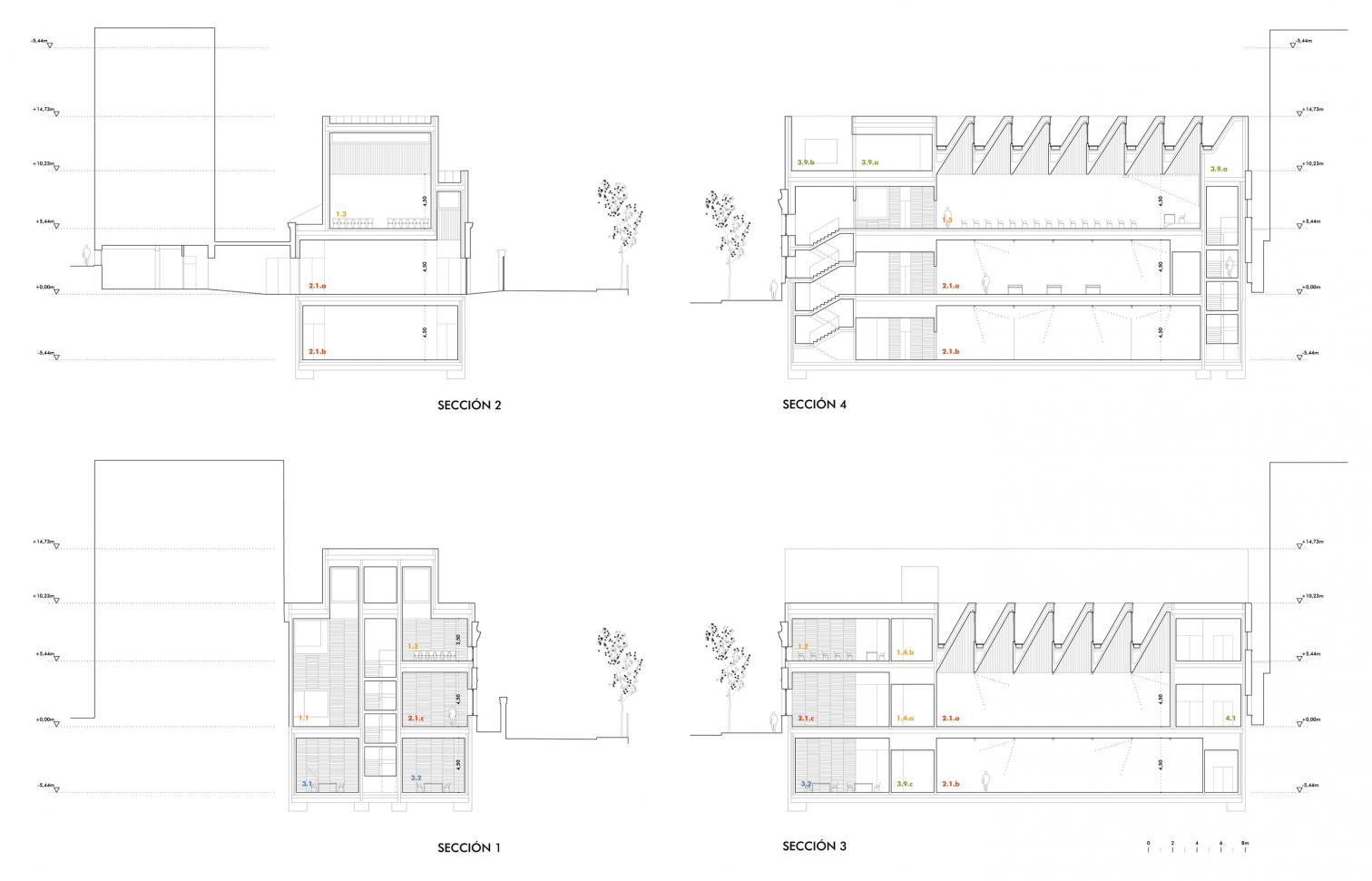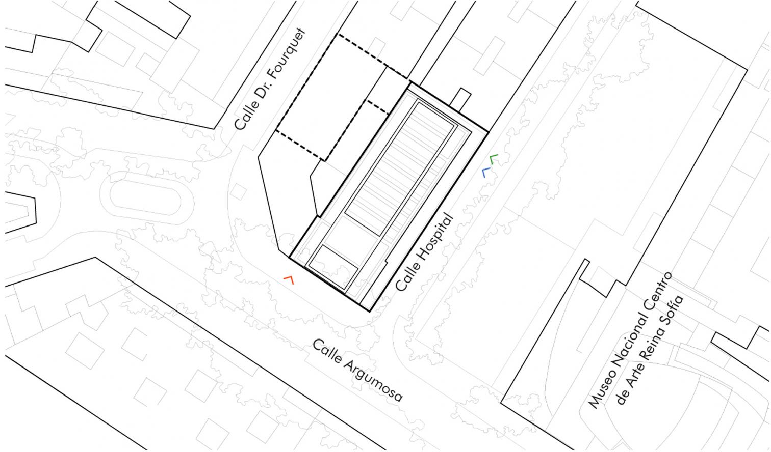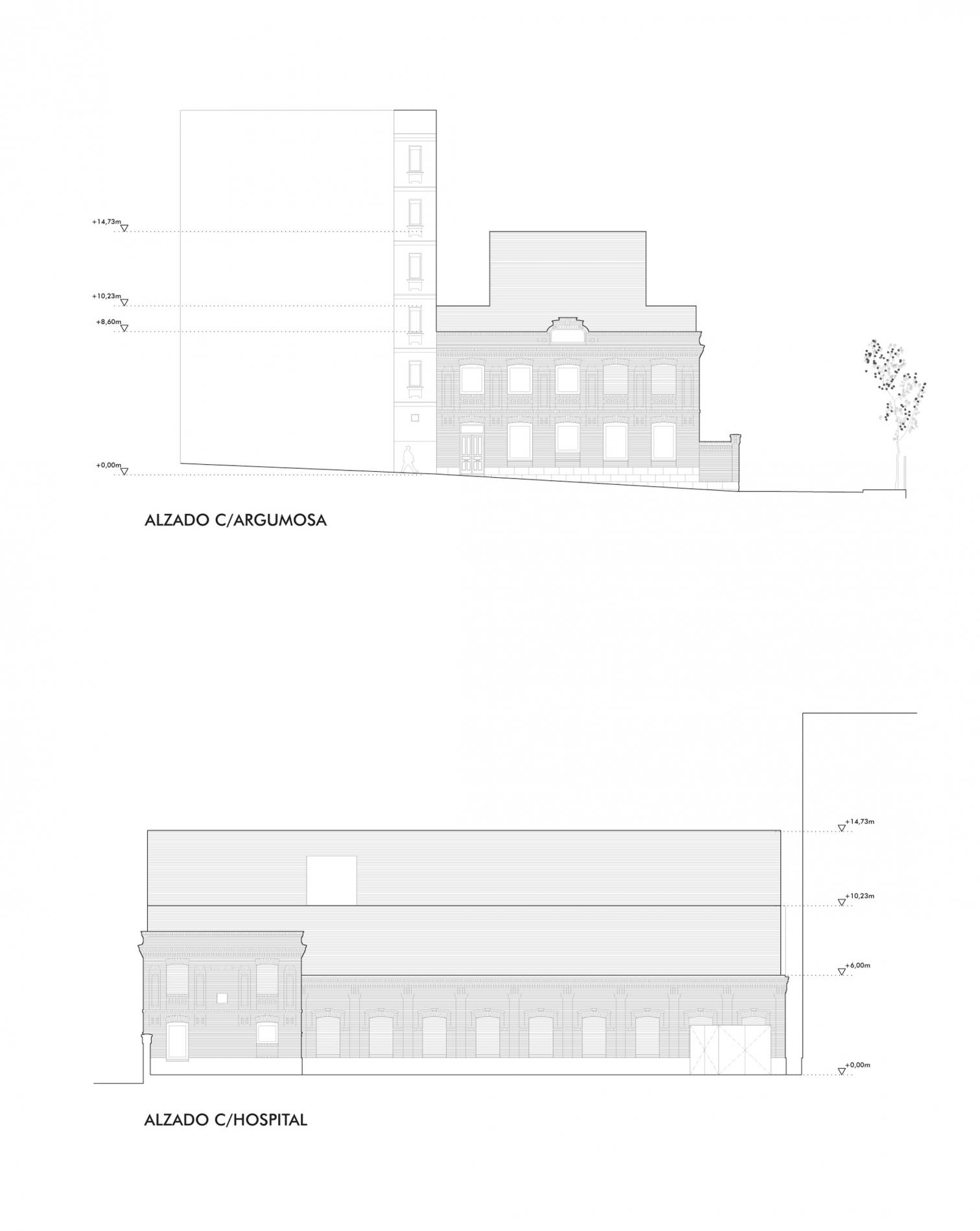 Basada en la flexibilidad, la eficiencia energética y la integración patrimonial, la propuesta reconoce el carácter dual del edificio original, con una fachada representativa hacia la calle Argumosa y otra más industrial y discreta hacia la calle Hospital. En este sentido, la intervención dialoga con esa dualidad, respetando las simetrías de Argumosa y proponiendo un alzado aterrazado de fuerte horizontalidad hacia Hospital, que favorece la entrada de luz. Además, el volumen se retranquea para ensanchar al máximo el patio, en línea con el resto de los edificios, y distanciarse de la corrala vecina.