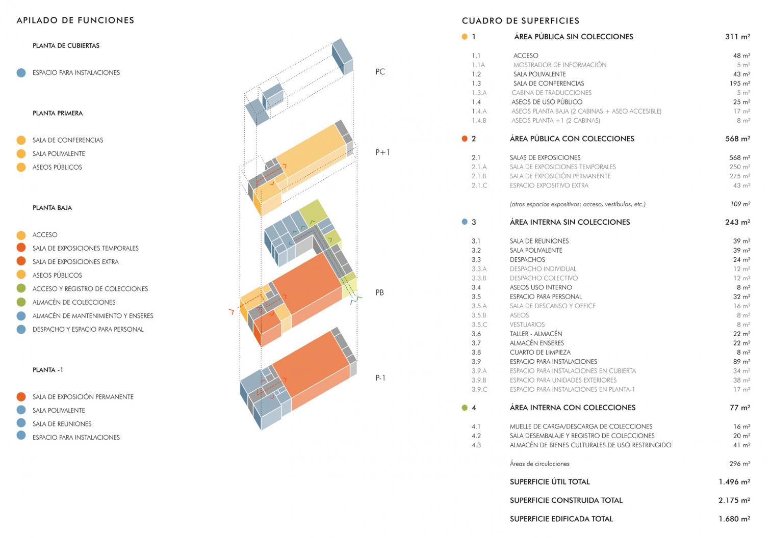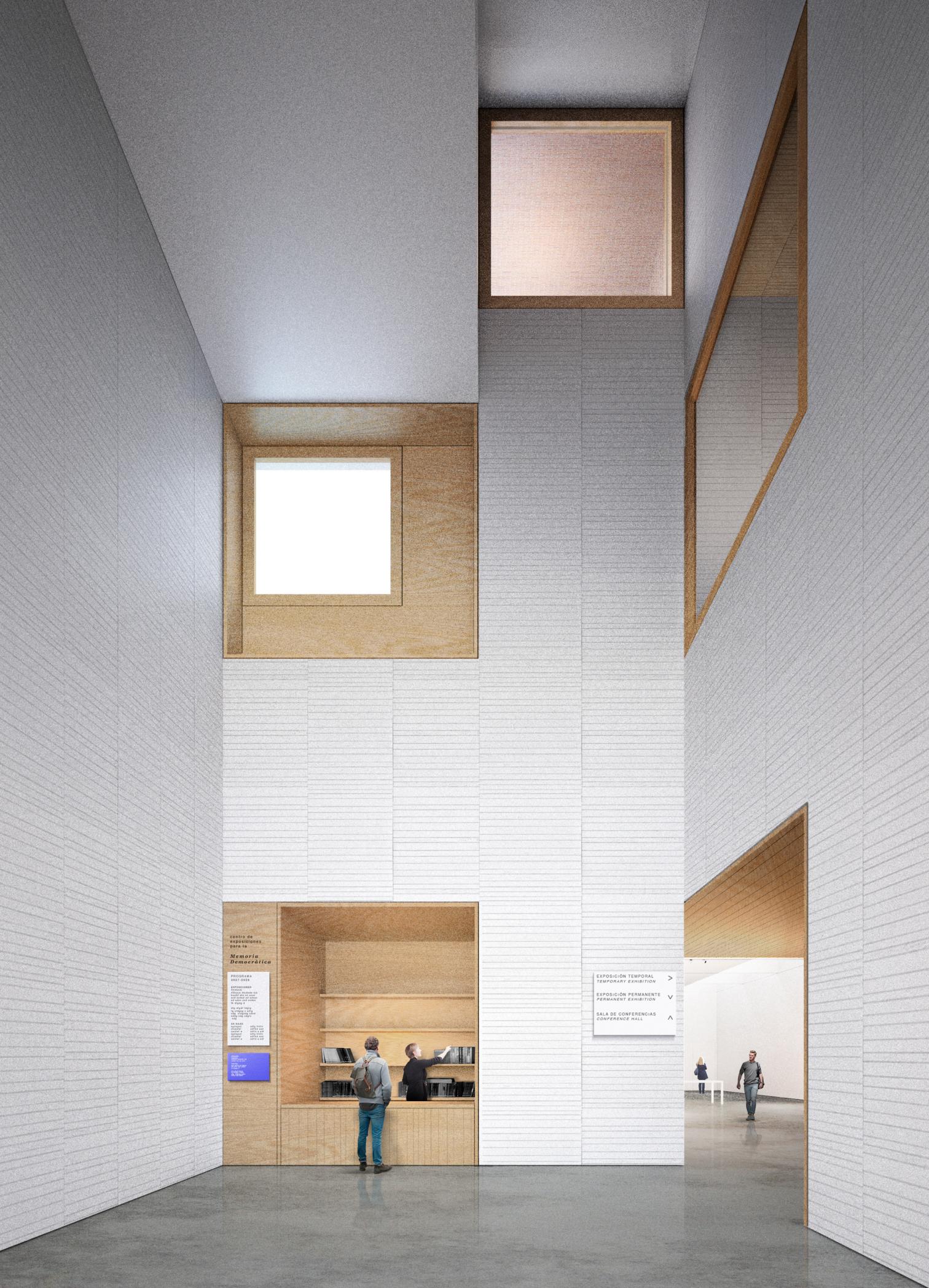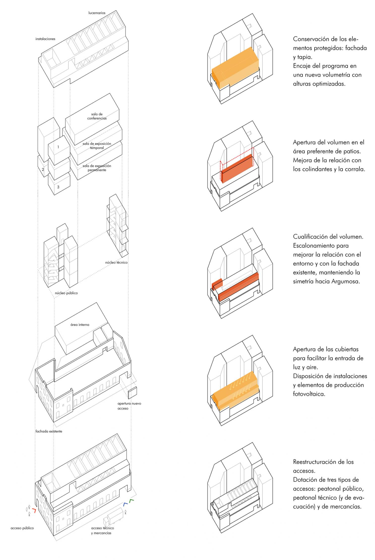 El proyecto ganador plantea una intervención respetuosa con el patrimonio, insertando un nuevo volumen —la llamada ‘caja de la memoria’— dentro del edificio neomudéjar existente, conservando sus muros originales. Esta nueva caja, construida en ladrillo similar al existente, alberga tres grandes salas superpuestas, de características espaciales similares, pero con diferentes soluciones lumínicas, adaptables a las necesidades expositivas del centro.