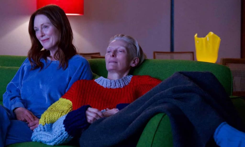 Requería un director extraordinario como Almodóvar para adaptar una novela extraordinaria. Sigrid Nunez, autora de Cual es tu tormento (2020), tiene una narrativa muy estática, que se basa mucho en los pensamientos o ideas de sus personajes, por lo mismo, la actuación tanto de Tilda Swinton y Julianne Moore se vuelve más sorprendente, al poder expresar con la cara tantas cosas. Esta historia trata al parecer de temas contradictorios: amistad y muerte. Pero la película los malabarea de forma increíble.