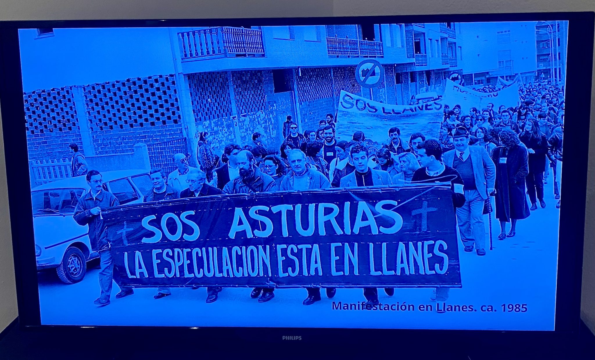 Entre las imágenes capturadas por este fotoperiodista “de gran olfato para la noticia, muy polifacético y diverso al que nada se le ponía por delante” y proyectadas en la misma pantalla, un momento de una manifestación en Llanes contra la especulación urbanística del año 1985. Entre los personajes que aparecen tras la pancarta podemos ver al sindicalista Emilio Huerta ‘Triki’, al filósofo Gustavo Bueno o al cronista del concejo, José Ignacio Gracia Noriega. También aparecen María José Rodríguez (AVALL), Alfonso Román, Rodrigo Rossi y el piloñés Pepe Luís Diego.