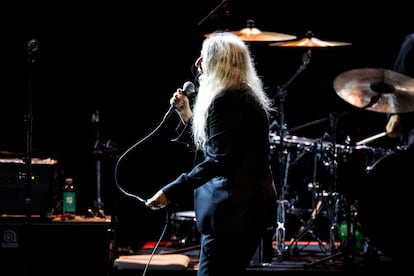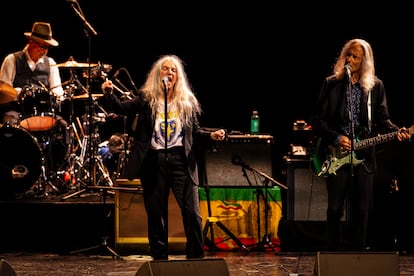 Patti Smith (Chicago, 78 años) ofreció un sensacional concierto anoche en Madrid ante 1.600 personas (lleno), entre ellas algunos músicos como Rosalía (sí, ella), Leiva o Abraham Boba. Fue un recital corajudo, reivindicativo, poético, bello. Y punk: llegó a escupir en la tarima (¡del Teatro Real!) en el fervor de People Have the Power, justo al final. Se trataba de celebrar los 50 años de su primera obra, Horses (1975), un álbum que todavía hoy suena vigoroso y aventurero, un disco que lanzó con 28 años, después de haberse mudado a Nueva York con 19 para desarrollarse como persona y como artista, que en su caso es indisoluble. Era el Nueva York de The Velvet Underground, de Andy Warhol, de las fiestas en galerías de arte, de las drogas duras, del alumbramiento del punk, de antros como el CBGB… Un Nueva York donde había espacio para formarse como persona, pero también para destruirse. Ella sobrevivió; no así muchos de sus amigos, y a algunos recordó anoche. Empezó como poeta, pero luego devino en cantante. Intimó con el fotógrafo Robert Mapplethorpe, que la inmortalizó en aquella descarada e icónica portada de Horses: andrógina, con tirantes, la chaqueta al hombro “a lo Frank Sinatra” y una mirada intimidante y a la vez relajada, la de una mujer hambrienta por entregarse a lo que le deparara la vida.