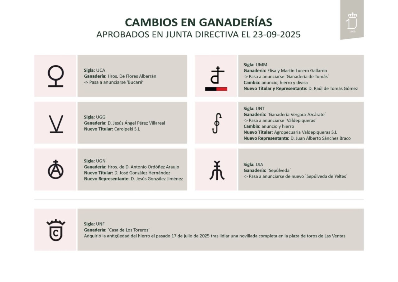 La Real Unión de Criadores de Toros de Lidia (RUCTL) ha informado de los últimos cambios aprobados en su registro oficial de ganaderías tras la celebración de su Junta Directiva el pasado 23 de septiembre. El regreso de Sepúlveda de Yeltes, Bucaré o la incorporación de Ganadería de Tomás, propiedad del futbolista Raúl de Tomás, son las principales novedades en la RUCTL. Dichas modificaciones son las siguientes: