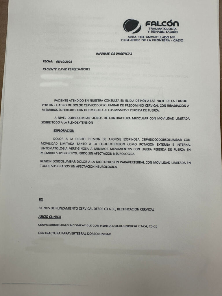 David de Miranda ha sido atendido de urgencia en la Clínica Falcón de  Traumatología y Rehabilitación (Jerez de la Frontera), donde las pruebas radiológicas  confirmaron un pinzamiento cervical entre las vértebras C3 y C6, por lo que los  especialistas han prescrito reposo absoluto. El torero será sometido a una nueva  exploración médica dentro de diez días, para valorar su evolución.