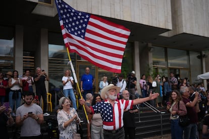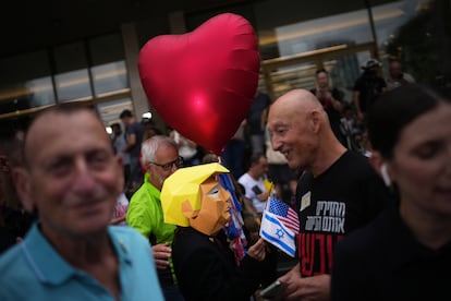 Una persona con una máscara de Donald Trump celebra en la plaza de los Rehenes de Tel Aviv el acuerdo entre Israel y Hamás, este jueves. Emilio Morenatti (AP)