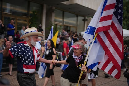Dos personas bailan tras el acuerdo alcanzado por Israel y Hamás, este jueves en Tel Aviv. Emilio Morenatti (AP)