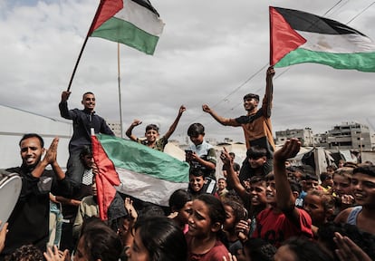 Un grupo de palestinos celebraba este jueves en Jan Yunis, en Gaza, el acuerdo alcanzado entre Israel y Hamás en Egipto.Abed Rahim Khatib (Anadolu/Getty Images)