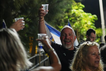 Varias personas brindan tras el acuerdo alcanzado por Israel y Hamás, este jueves en Tel Aviv.Emilio Morenatti (AP)