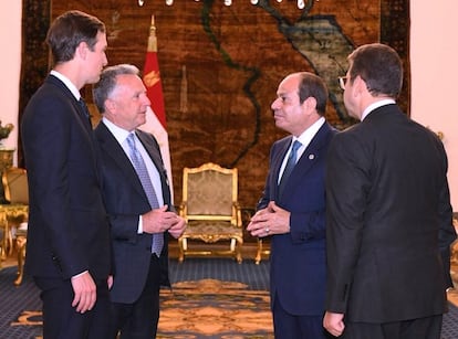 El presidente egipcio, Abdelfatá Al Sisi (segundo por la derecha) se reúne con el enviado para Oriente Medio del presidente estadounidense Donald Trump, Steve Witkoff (segundo por la izquierda), y el yerno de Trump, Jared Kushner (izquierda), en el Palacio Presidencial de El Cairo, Egipto, este jueves.AP/LaPresse