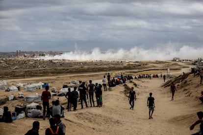 Fuerzas israelíes llevan a cabo un ataque para impedir que los palestinos crucen hacia el norte de la Franja por la calle Rashid, a pesar del acuerdo de alto el fuego alcanzado, este jueves en Deir Al Balah.Anadolu (Anadolu via Getty Images)