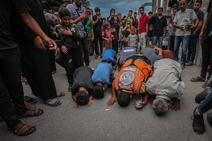 Palestinos rezan frente al hospital Bautista Al Ahli para celebrar el acuerdo entre Hamás e Israel, este jueves en Ciudad de Gaza.Anadolu (Anadolu via Getty Images)