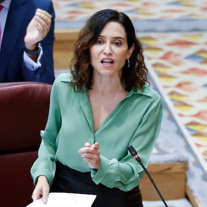 MADRID, 09/10/2025.- La presidenta de la Comunidad, Isabel Díaz Ayuso, interviene durante el pleno de la Asamblea de Madrid, este jueves. EFE/ Chema Moya