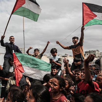 DEIR AL BALAH, GAZA – OCTOBER 09: Palestinians, including children, gathered at the Nuseirat refugee camp celebrate with Palestinian flags after the announcement of the ceasefire agreement in Gaza on October 09, 2025 in Deir al-Balah, Gaza. A ceasefire agreement between Israel and Hamas came into effect in the Gaza Strip on Thursday following marathon mediation efforts to end a two-year deadly war in the Palestinian enclave. Israel’s public broadcaster KAN confirmed that the ceasefire deal took effect in the enclave. (Photo by Moiz Salhi/Anadolu via Getty Images)FOTO: Anadolu via Getty Images