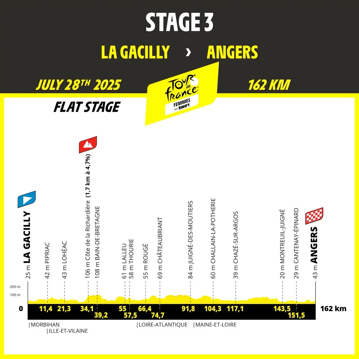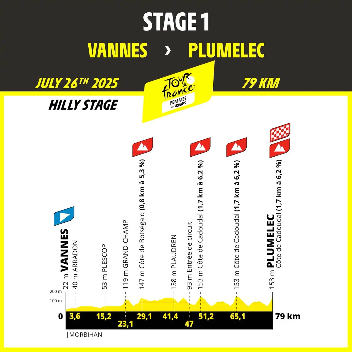 El pelotón inicia su etapa bretona en Morbihan, con una etapa entre Vannes y Plumelec; las corredoras que triunfaron en la côte de Cadoudal en el Grand Prix du Morbihan conocerán el final de esta etapa. Al día siguiente, en Finisterre, los corredores necesitarán potencia explosiva si quieren ponerse por delante en Quimper, en el puerto donde Peter Sagan ganó en 2018. El recorrido de 2025 tendrá luego llegadas al sprint en Angers (etapa 3) y Poitiers (etapa 4), antes de ofrecer terrenos cada vez más exigentes en Creuse en el camino a Guéret (etapa 5) y subir aún más la apuesta en el departamento de Puy-de-Dôme, donde las piernas de los corredores se pondrán a prueba en los puertos de Béal y Chansert (etapa 6).