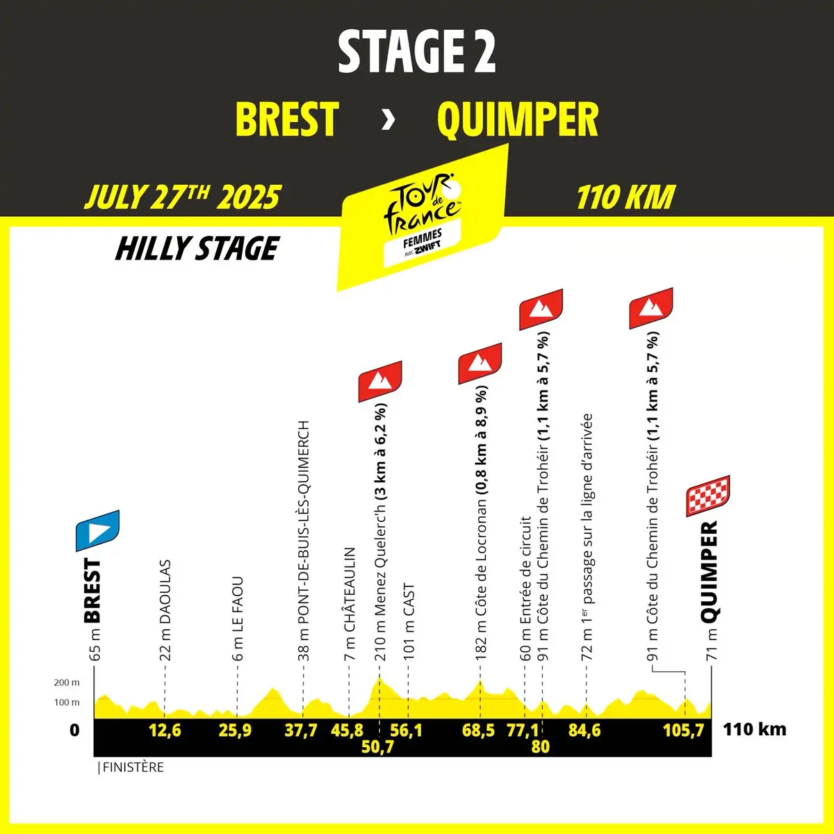 Como durante el Tour de 2021, el pelotón partirá desde el puerto comercial. Después de seguir la costa y atravesar Châteaulin, meca del ciclismo, se encontrará con el Menez Quelerc’h (3 km al 6,2%). Por Locronan, esta etapa 100% finisterre desembocará en Quimper en un bucle poco llano y salpicado de dos baches, con la meta en lo alto del segundo. El ganador de la jornada habrá sabido inevitablemente combinar resistencia y poder.