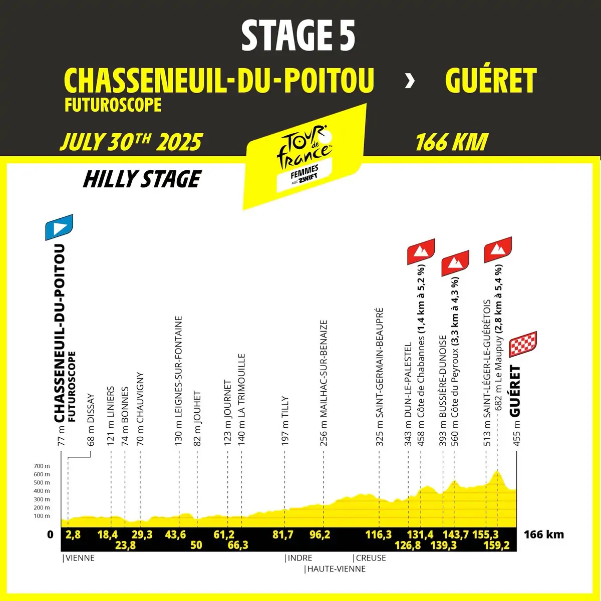 Desde la salida de esta larga etapa, las corredoras pasarán, en Jaunay-Marigny, por delante del departamento de carreras de FDJ-Suez, el equipo que, apoyado por Futuroscope, celebra veinte años de presencia en el pelotón femenino. En Chauvigny, ciudad etapa del Tour 2020, cruzarán la plaza Raymond-Poulidor y luego, por pequeñas carreteras y por Dun-le-Palestel, deberán cruzar el Maupuy (2,8 km al 5,4%) antes de llegar a Guéret.